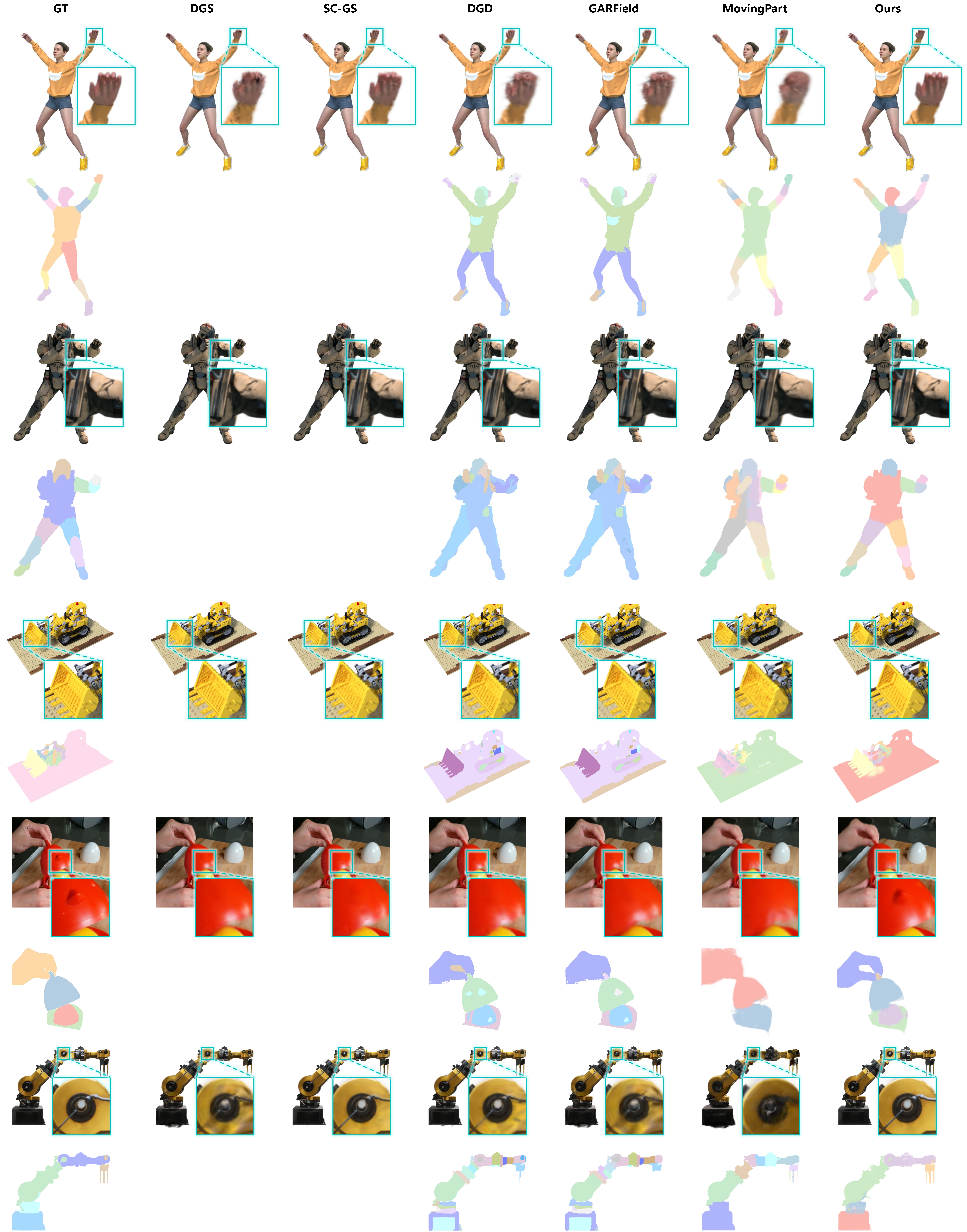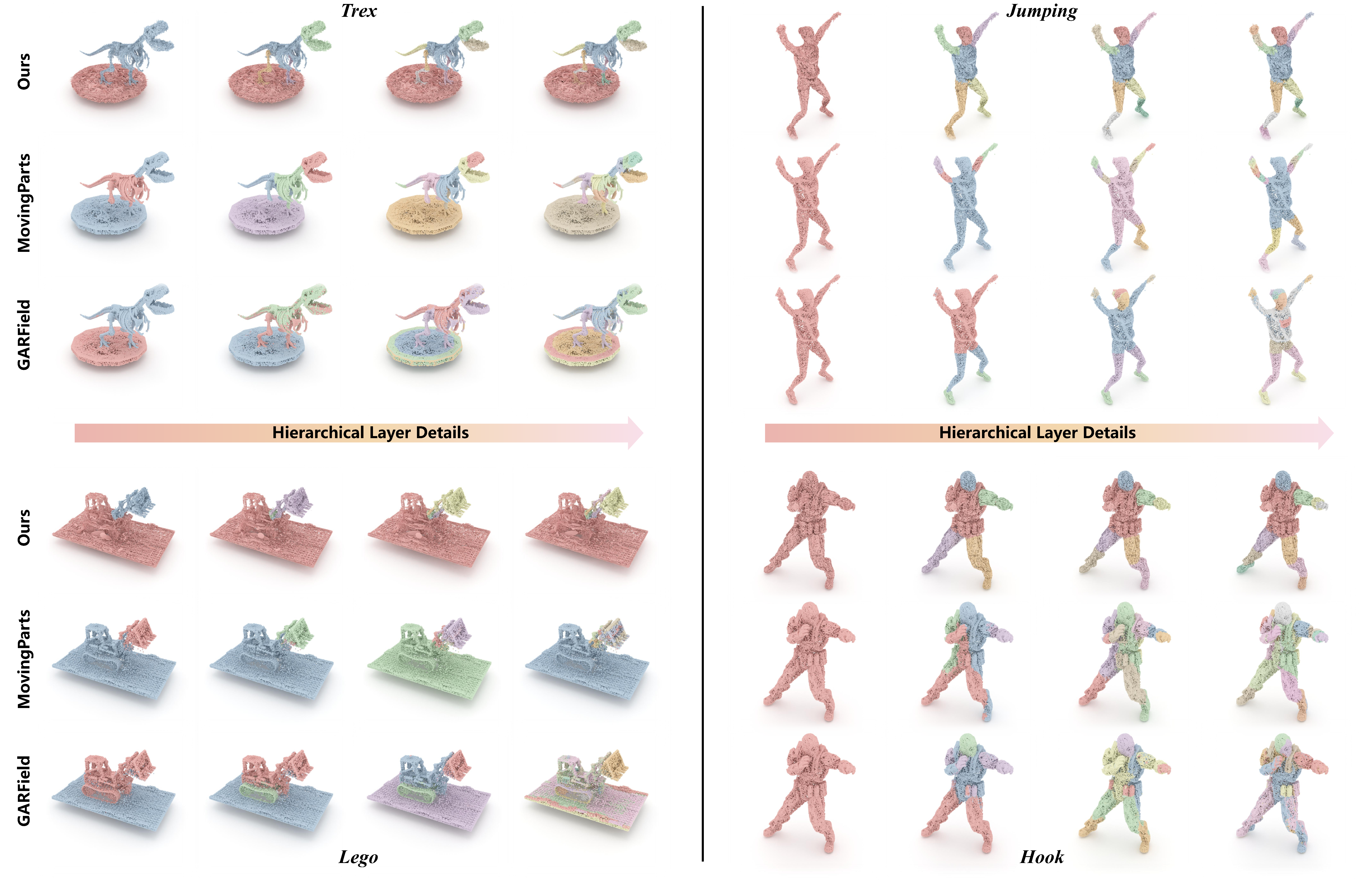 Visual comparison of hierarchical Gaussian decomposition between our method, GARField and MovingPart.